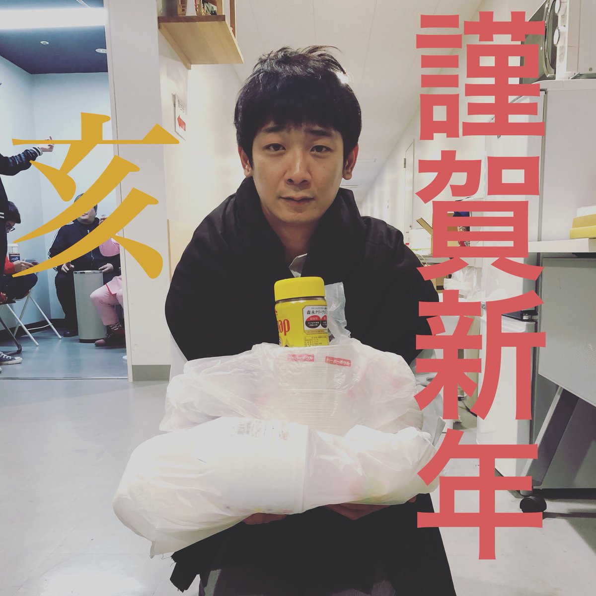 あけましておめでとうございます🎍🌅 亥で年男です!本年も何卒よろしくお願い致しますm(_ _)m ※袴と鏡餅がなく急遽あるもので代用 ※携帯から遠く離れて見てください