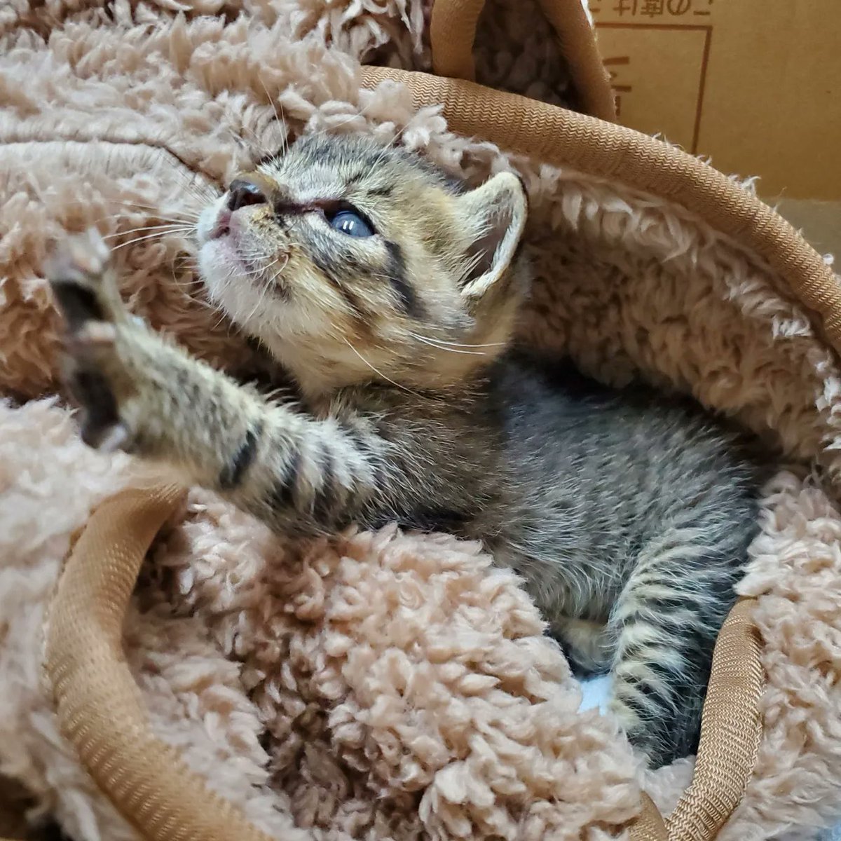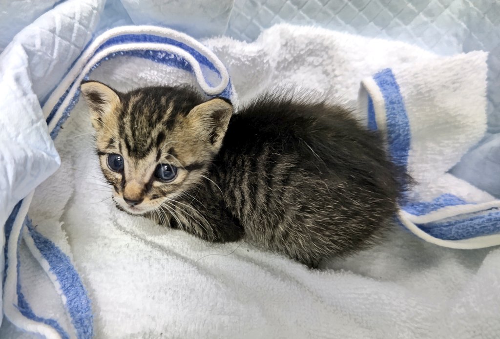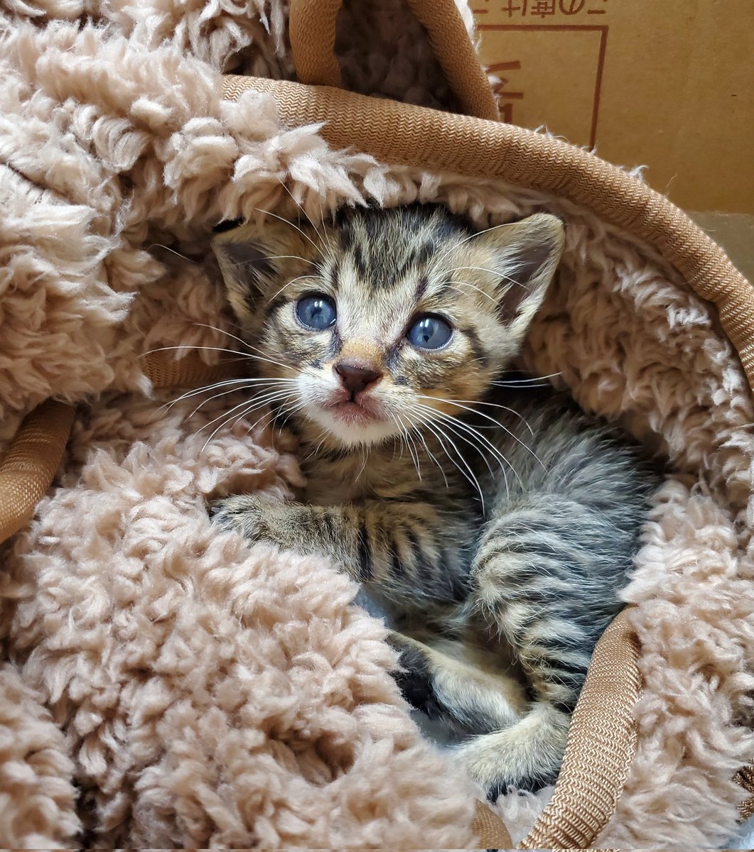 だいぶ元気にはなってきた! 鳴き声の合間にゴロゴロ言います。かわいい。これから動物病院へ連れていってもらうのだよ。