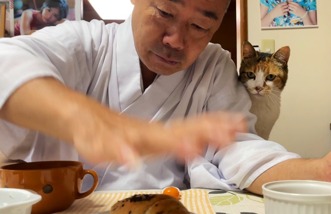 パンをつぶす気マンマン住職と、なんとも言えない顔でそれを見守る猫のミー子。 youtu.be/Cq8rMKdFR8I @YouTubeより