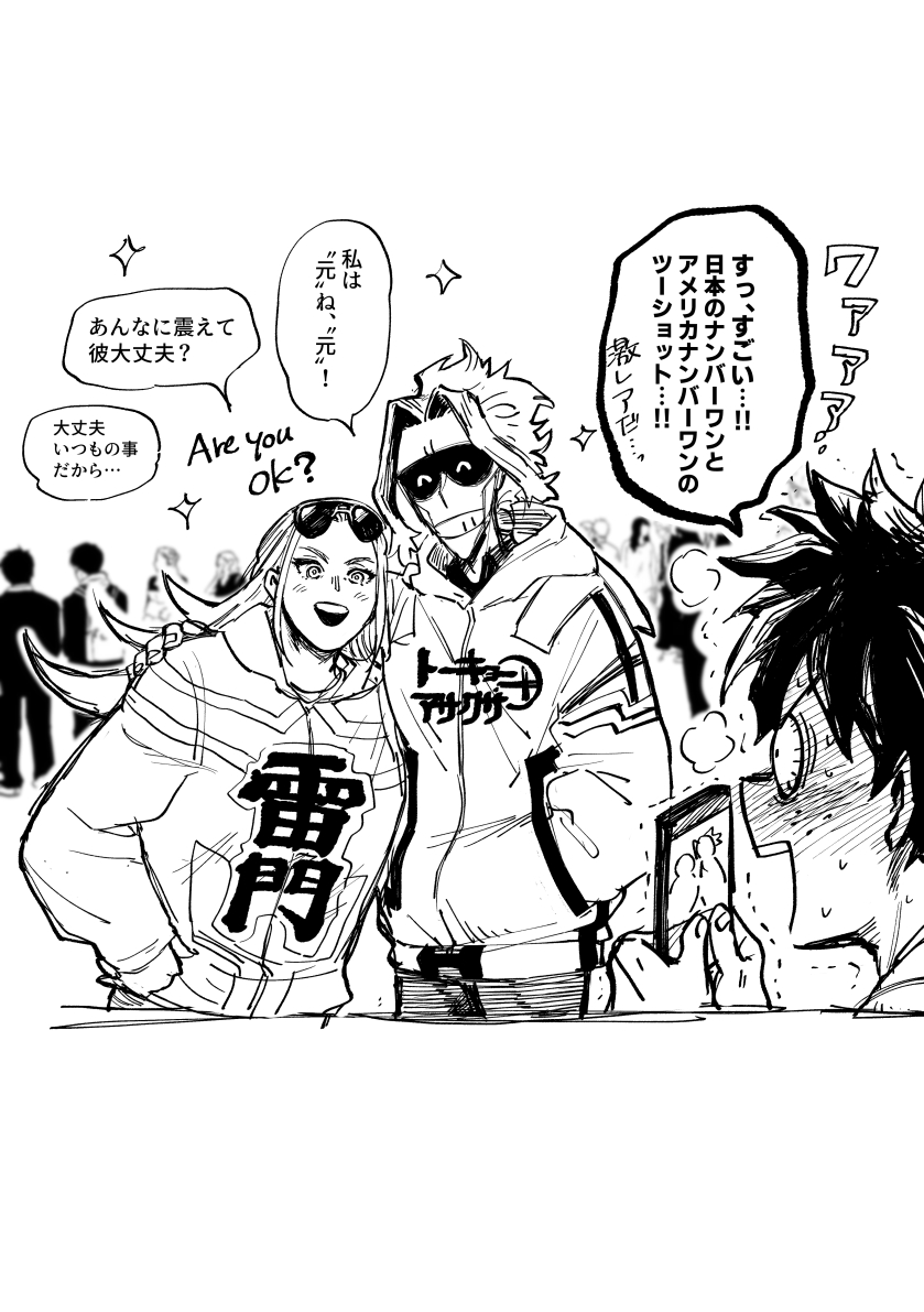 🌟さんラクガキ2枚。 1.🌟の夢モブ軍人になりた過ぎる。 2.🌟+🐐+🥦。こんな未来が見たかったなあ…というらくがき。⚡門マイトパーカーはヴィ…ンテに出てきたやつです。
