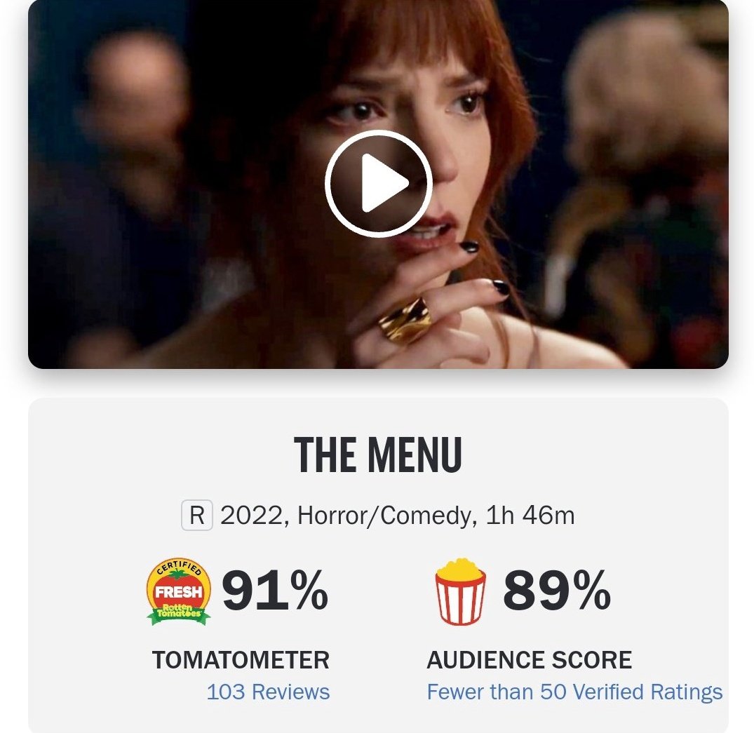 O suspense ‘O Menu’ está com 91% de aprovação da crítica no Rotten Tomatoes. O longa segue um casal que viaja para conhecer um restaurante exclusivo, onde o chef preparou um cardápio com algumas surpresas chocantes.