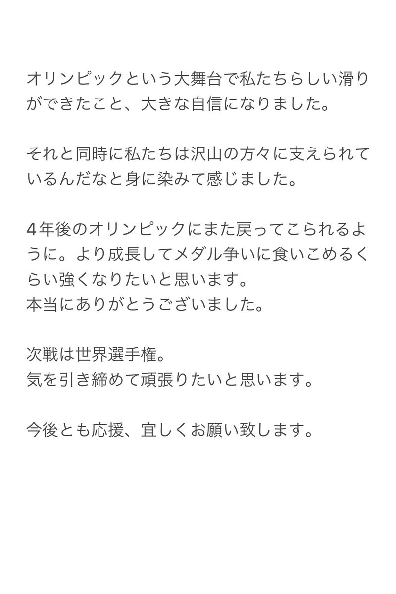 この度、北京オリンピック2022の代表として素晴らしいメンバーの一員になることができ、本当に嬉しく思います。