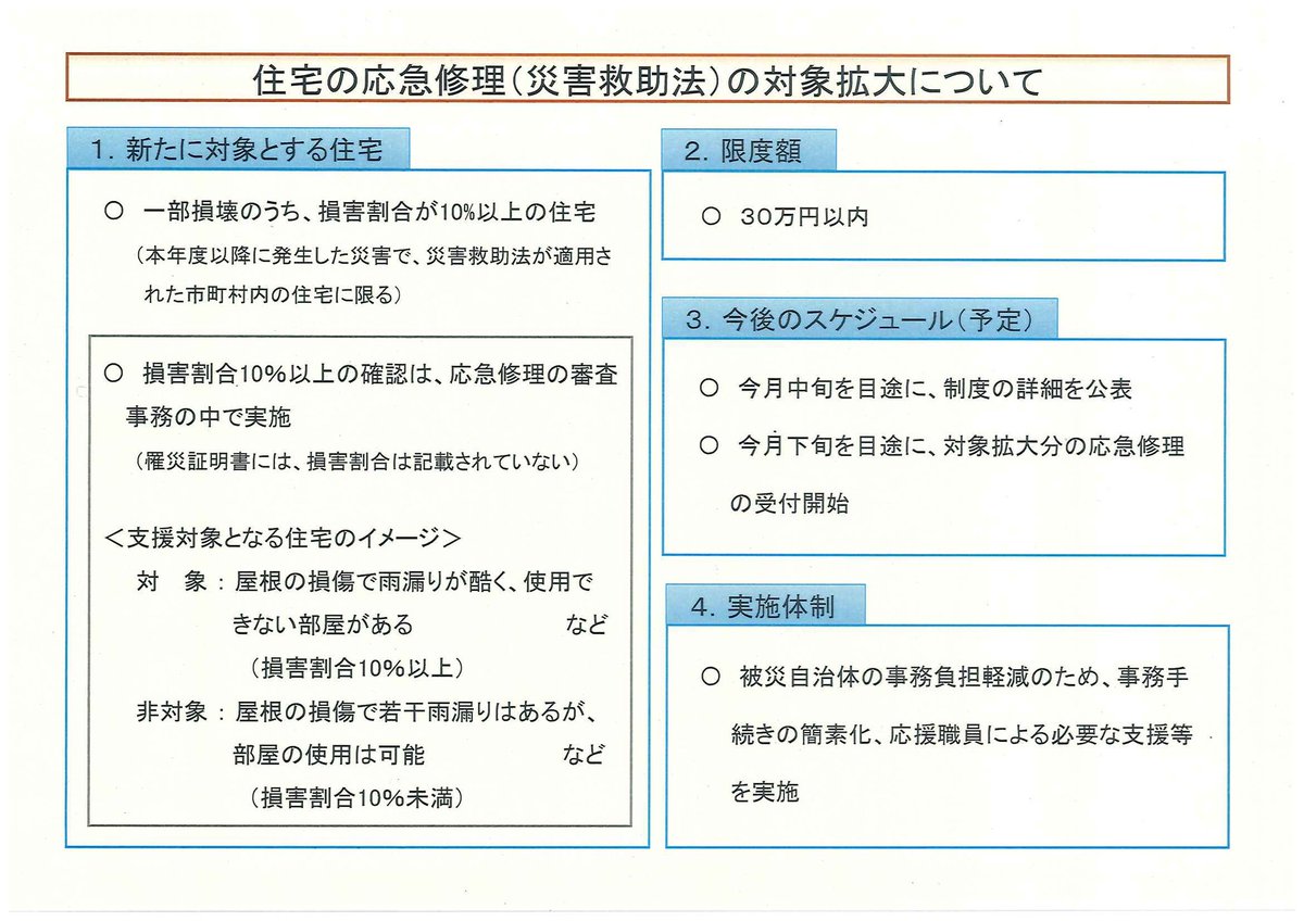 情報更新🌟住宅支援の部分では、半壊と一部損壊の間に、「準半壊」という区分が新たに設けられ、最大30万円の支援がありますので、一部損壊ではなく、準半壊などの認定をとることも支援を受ける上で重要になります。