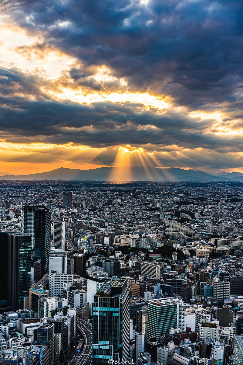渋谷スカイからの夕焼けと巨大な金床雲
