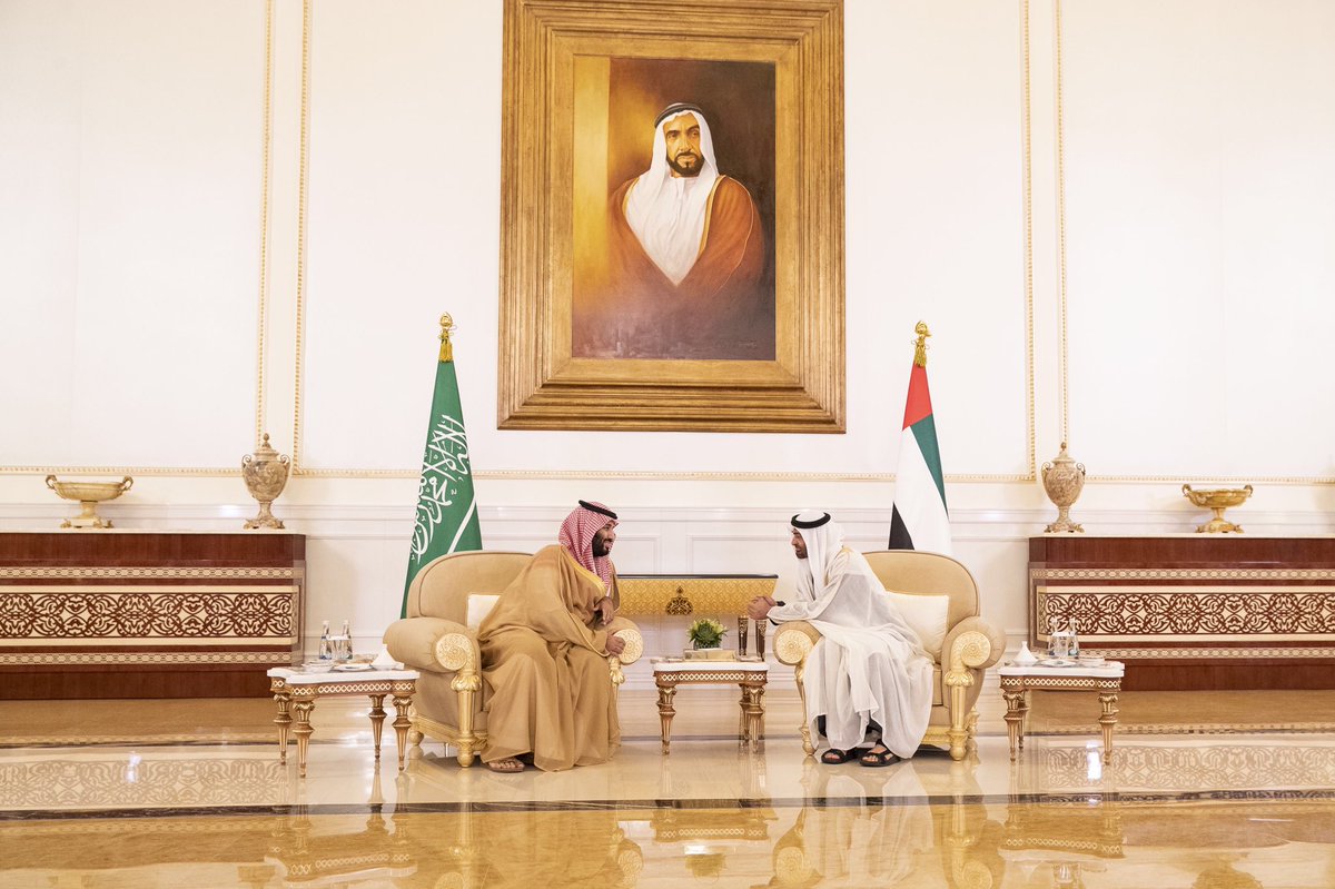 محمد بن زايد في وداع محمد بن سلمان لدى مغادرته البلاد بعد زيارة رسمية للدولة استغرقت ثلاثة أيام.