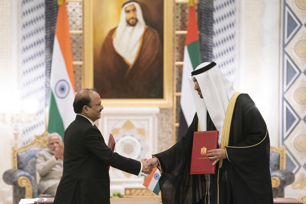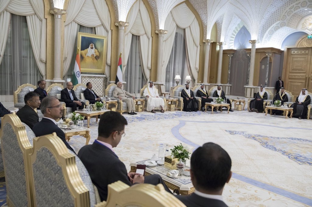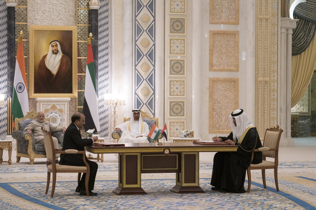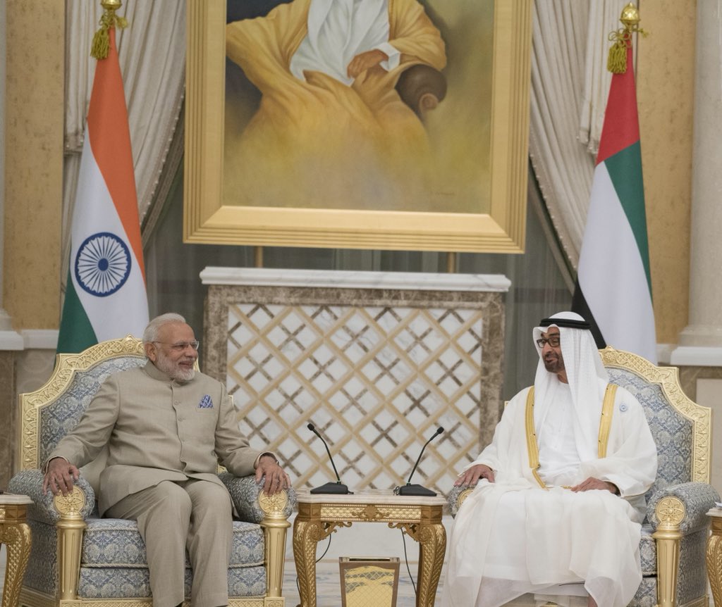 We warmly welcome our state guest and valued friend, the Indian Prime Minister H.E. @narendramodi to the UAE. His visit reflects our longstanding historical ties and is testament to our friendly bilateral relationship.