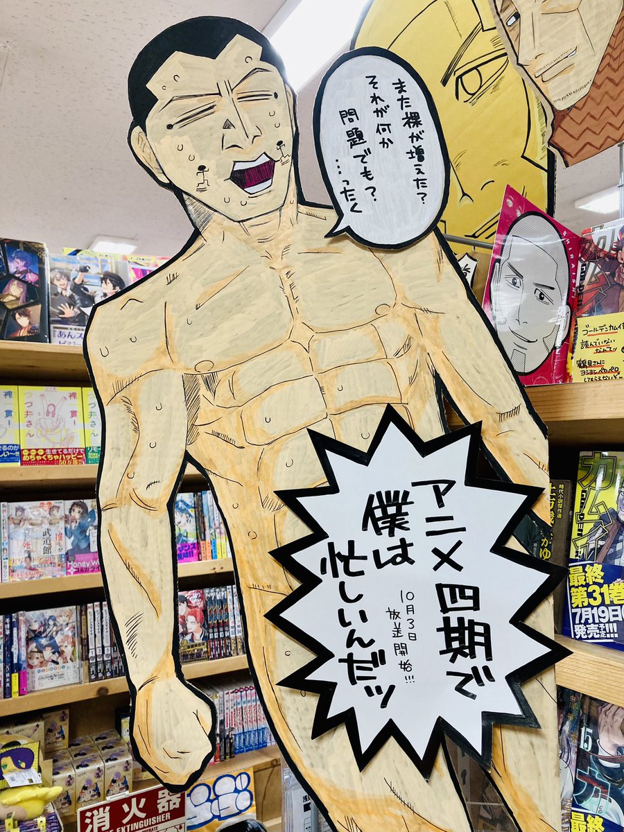 お待たせしました!本日 #ゴールデンカムイ 28巻入荷しました🍤🍤🍤新刊を盛り上げるべく店頭にはノラ坊がズドンと登場!また裸体を描いてしまった件については反省していますので許してください👼皆様のご来店お待ちしています!
