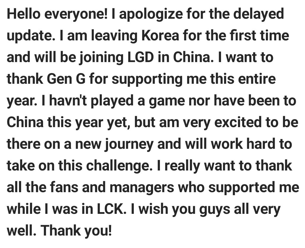 Hello, My contract with Gen G has just been terminated. Thank you all for your support during the season. I am officially a free agent now and will be waiting for future opportunities. I will see you guys soon from a new team!