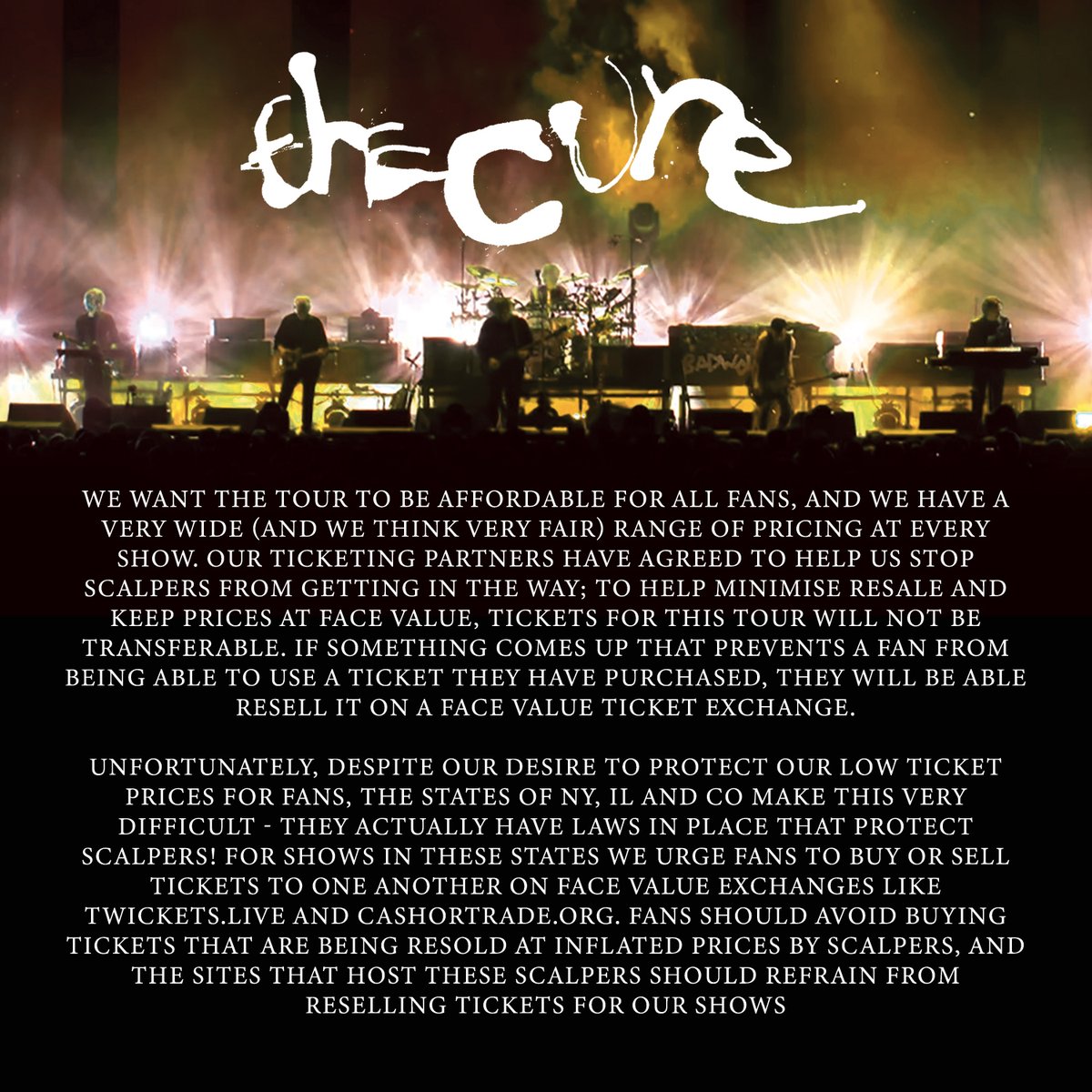AS OF 10TH MARCH, CURE TICKETS ARE NOT YET ON SALE. ANY TICKETS THAT ARE LISTED ON SECONDARY TICKET SITES ARE VERY LIKELY TO BE FAKE. IF ANY TICKETS ARE FOUND TO BE LEGITIMATE, WE WILL WORK WITH TICKETMASTER TO CANCEL THEM. ONWARDS.