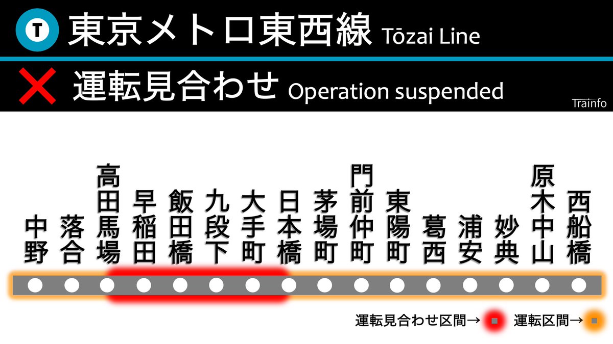 【東京メトロ東西線(高田馬場〜日本橋) 上下線 運転見合わせ】