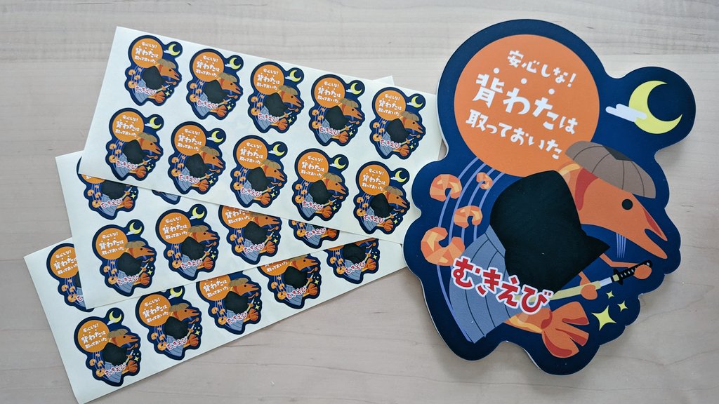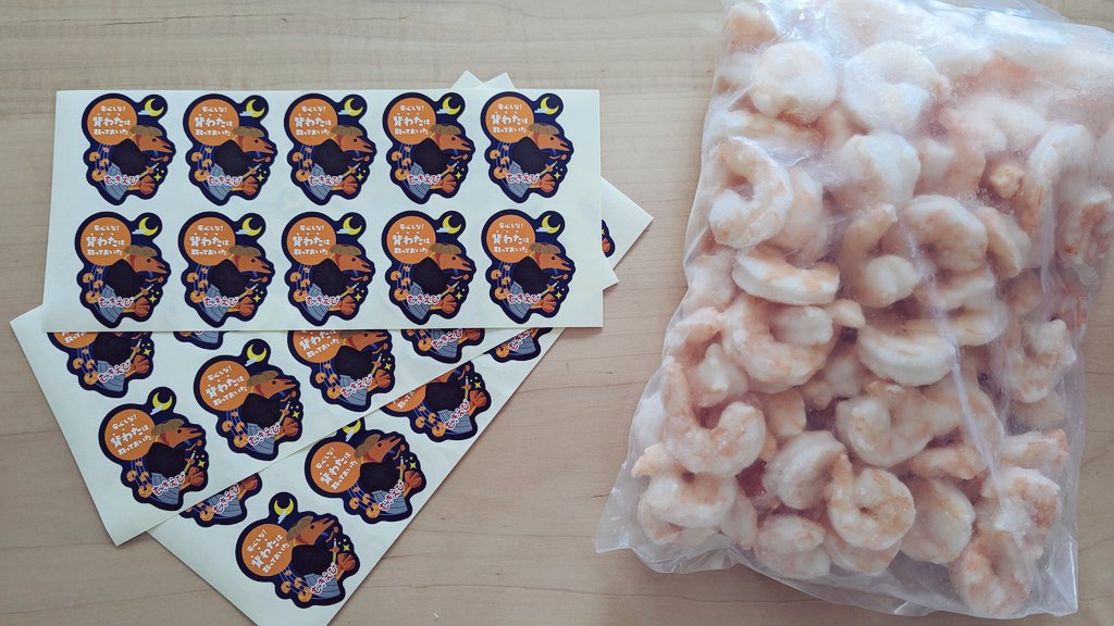 こちらのシールを使用している冷凍エビの加工販売会社、西華様( @_saika_sendai )まで届き、ありがたくもシールとパネル(名入り!)とむきエビをいただきました