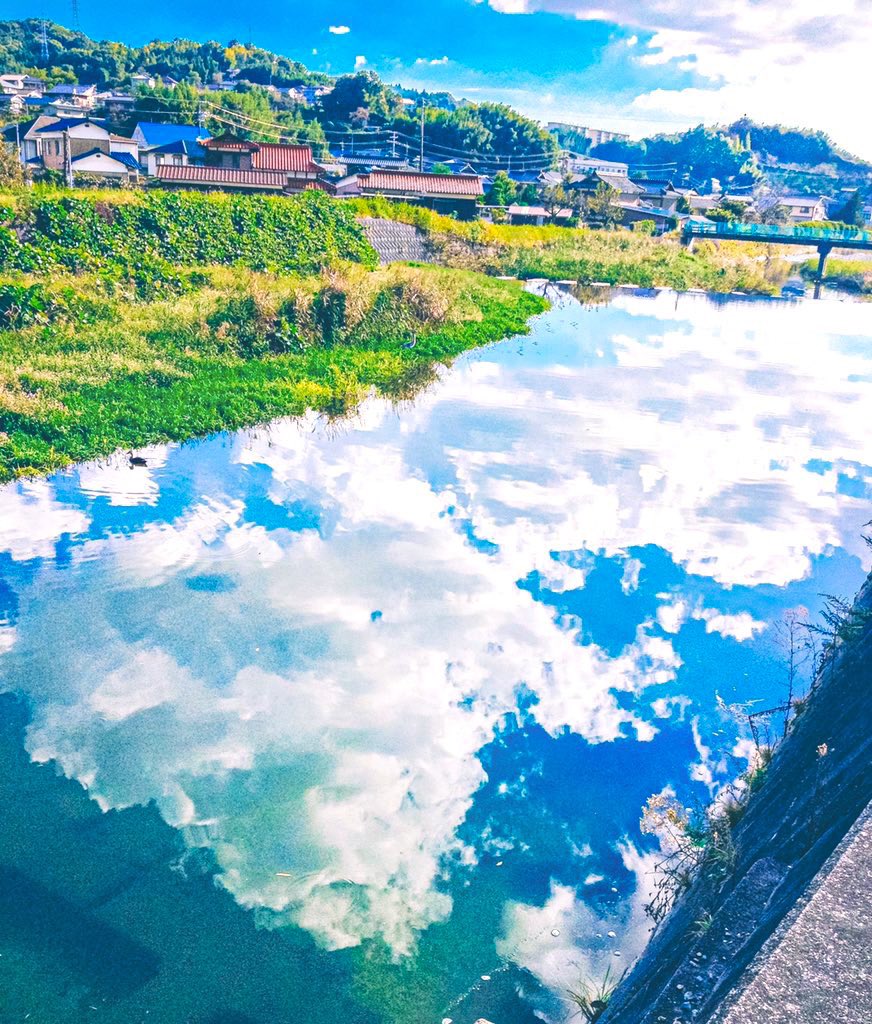 川の水面に反射する、アニメのような夏の青空。
