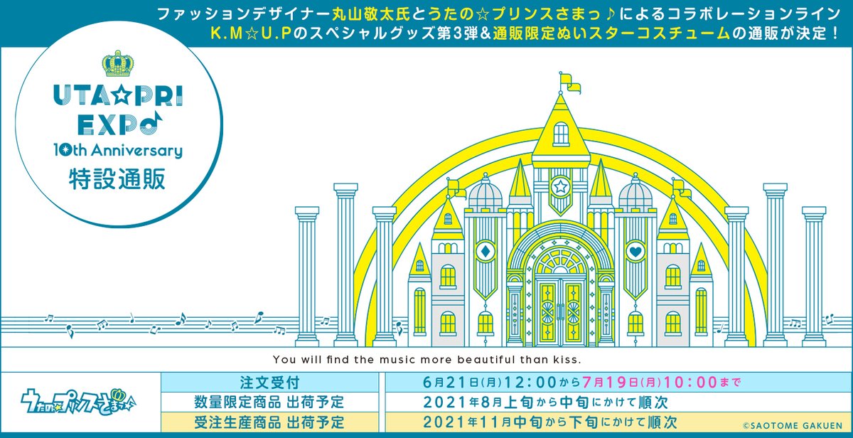 UTA☆PRI EXPOで販売される、ファッションデザイナー丸山敬太氏と「うたの☆プリンスさまっ♪」のスペシャルコラボ「K.M☆U.P」グッズの数量限定通販と、公式通販限定の「ぬいスターコスチューム」の受注生産が決定!