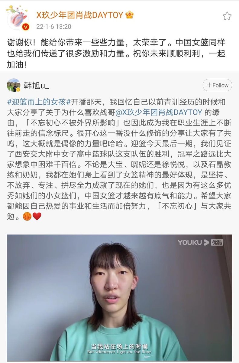 “ขอบคุณนะ ได้นำพลังมอบให้คุณ ถือว่าเป็นเกียรติมากเลย ทีมบาสฯหญิงของจีนก็มอบความกล้าหาญและพลังให้พวกเราเช่นกัน ขอให้อนาคตของคุณราบรื่น สู้ไปด้วยกันนะ!"