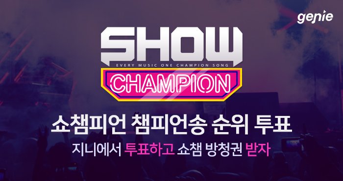 <알려드립니다> 6/5 (화) 오늘부터 “아이돌챔프 앱” 뿐만 아니라 “지니뮤직 홈페이지”와 “지니뮤직 앱”에서도 <쇼 챔피언> 투표가 가능해집니다! 여러분들의 많은 참여 부탁드립니다:)