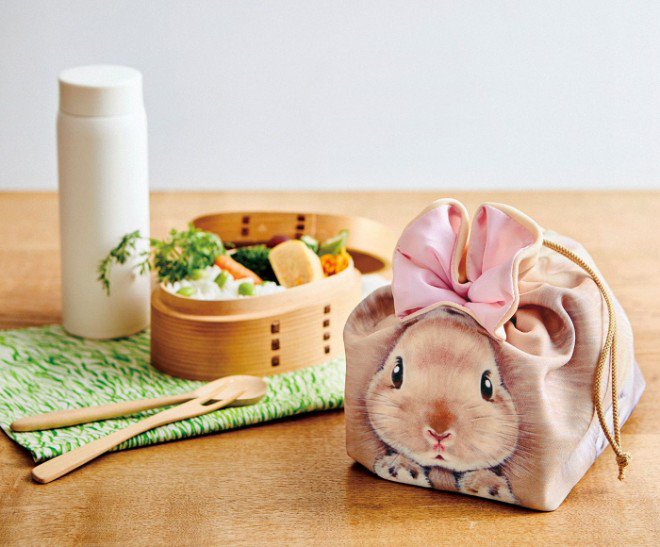 ひもをしぼると、入れ口がうさ耳形にピョンと立つきんちゃくが、お弁当ケースになって新登場です。内側はアルミ蒸着シートだから、保冷剤をいれても◎