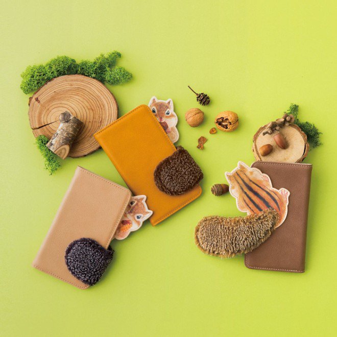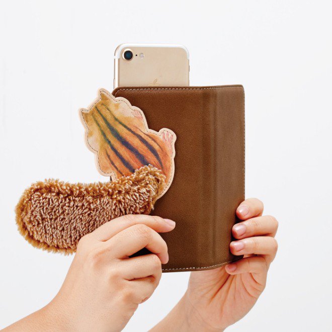 シマリスがじーっとみつめるスマホケースができました。ふわふわしっぽをスマホにくるんと巻きつけて、こちらをうかがうシマリスさん。スマホを上にスライドすればカメラも楽々使えます。
