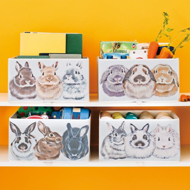 うさぎさんがむぎゅむぎゅっとひしめき合っている様子がプリントされたなんともかわいい収納ボックスです。4種類全部集めると、総勢12羽の大所帯!クローゼットの棚やラックにずらりと並べて、うさぎまみれの暮らしはいかがですか?