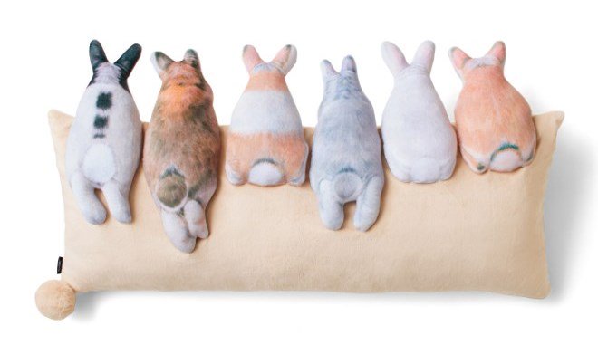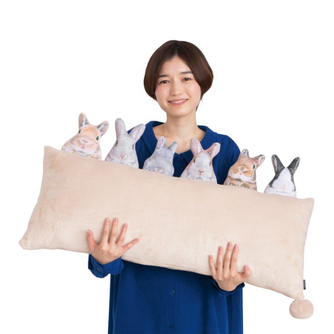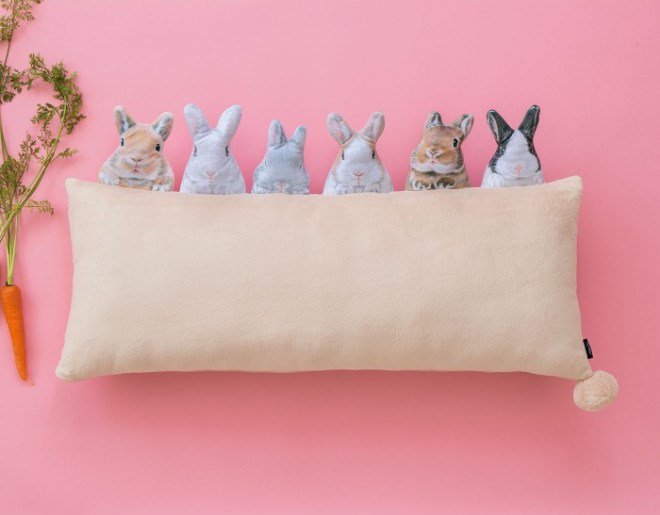 うさぎに囲まれてソファやベッドで一日中のんびり過ごす……そんな究極の癒し体験ができるかも!? 6羽のうさぎがのぞいているみたいなロングクッションができました。6つ並んだぷっくりしたおしりにもうメロメロです。