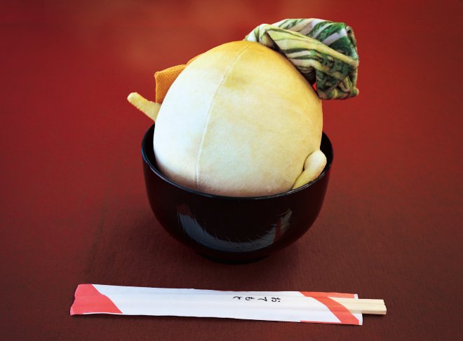 京都大報恩寺の冬の風物詩「大根焚き」という大根の煮物をモチーフにしたセクシー大根ポーチです。内側までお出汁がしみ込んだ茶色で、茎と葉もくったり。肩にはおあげが乗っていますよ。
