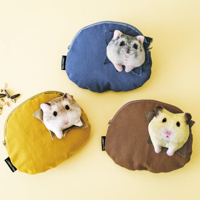 ポーチを突き破ってバリっと出てきたハムスターさんたち。思わず笑みがこぼれるハッピーデザインのポーチができました☀️うるうるした瞳、キョトンとした表情であなたを見つめます。裏面のぷっくりハムケツにも注目です☺️