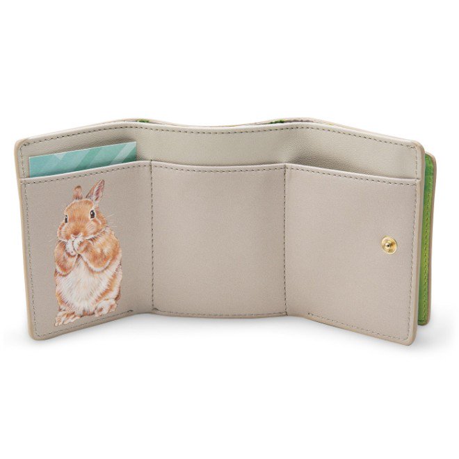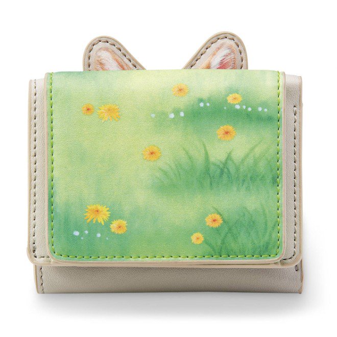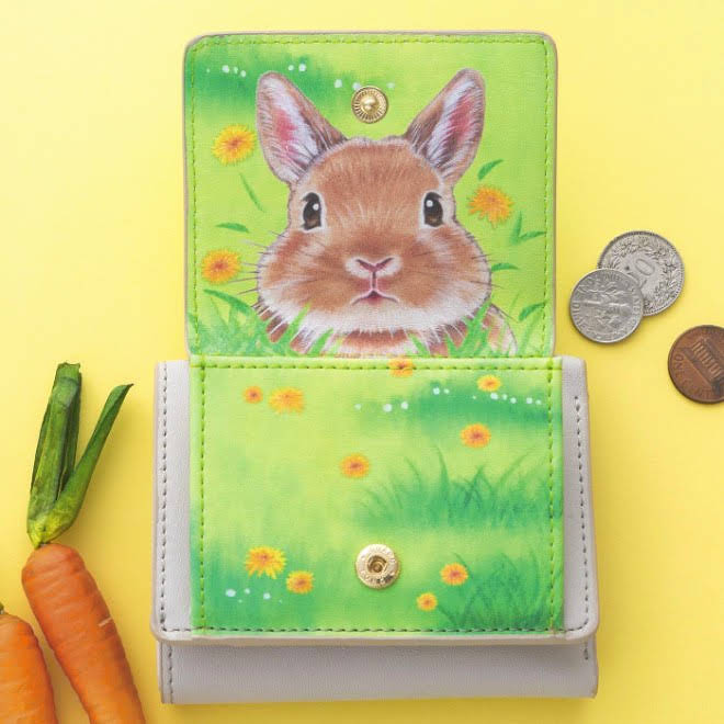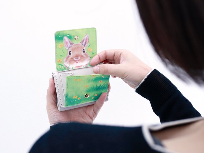 野原からのぞくうさ耳。パカッとフラップを開けば、かくれんぼしていたうさぎさんがぴょこっ!と顔をのぞかせるミニ財布です。