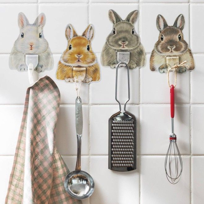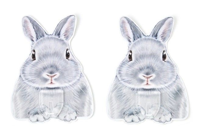壁に貼り付き、モノを受け取るうさぎさんのフック。おうちの中の「ちょっと掛けたい」平らな場所で、けなげにピタッとスタンバイ。玄関ではかぎや靴べら、洗面所では洗顔ネットやループ付きタオルを引っ掛けて♪再はく離タイプの粘着シールです。