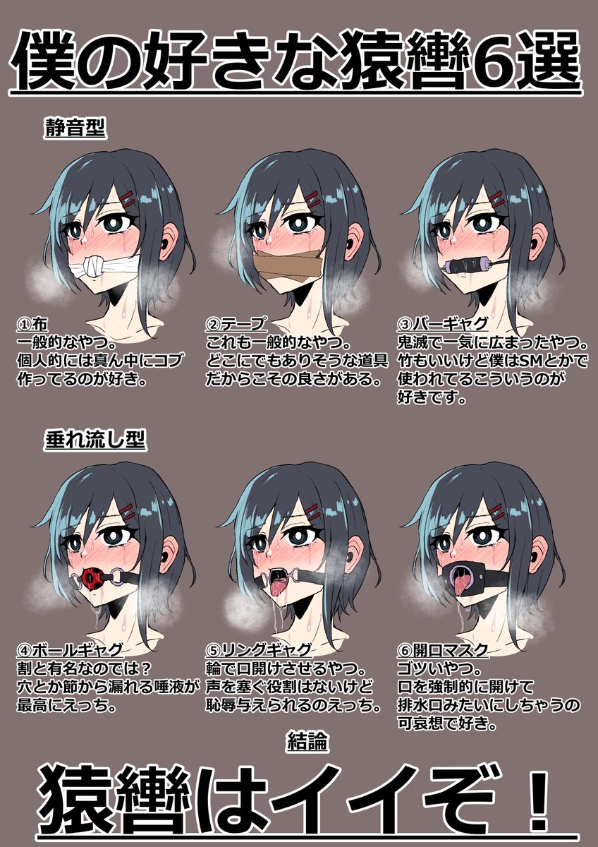 僕の好きな猿轡をなんとか6つに絞ってそれぞれの良さを記載したイラストを描きました。 これで世界のえっち絵描きの皆さんが猿轡をつけた拘束えっち絵を描いてくれたら僕は成仏できます。