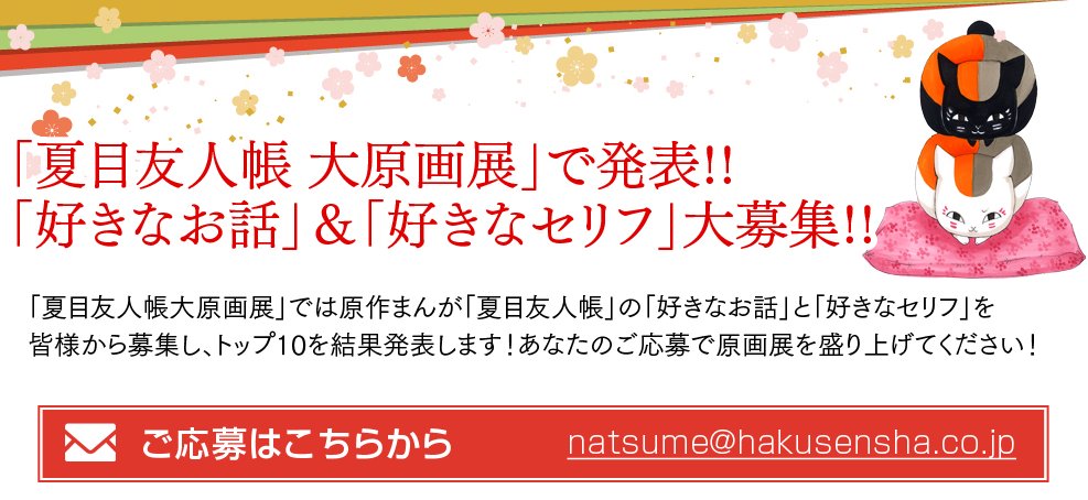 〆切9/29迫っています!夏目友人帳の「好きなお話」&「好きなセリフ」をただ今大募集中!あなたの感想が原画展で展示されるかも!応募者の方から300名に特製ポストカードをプレゼント!hakusensha.co.jp/natsume/genga