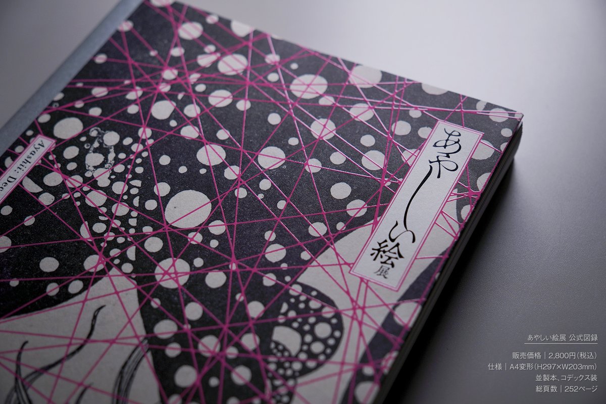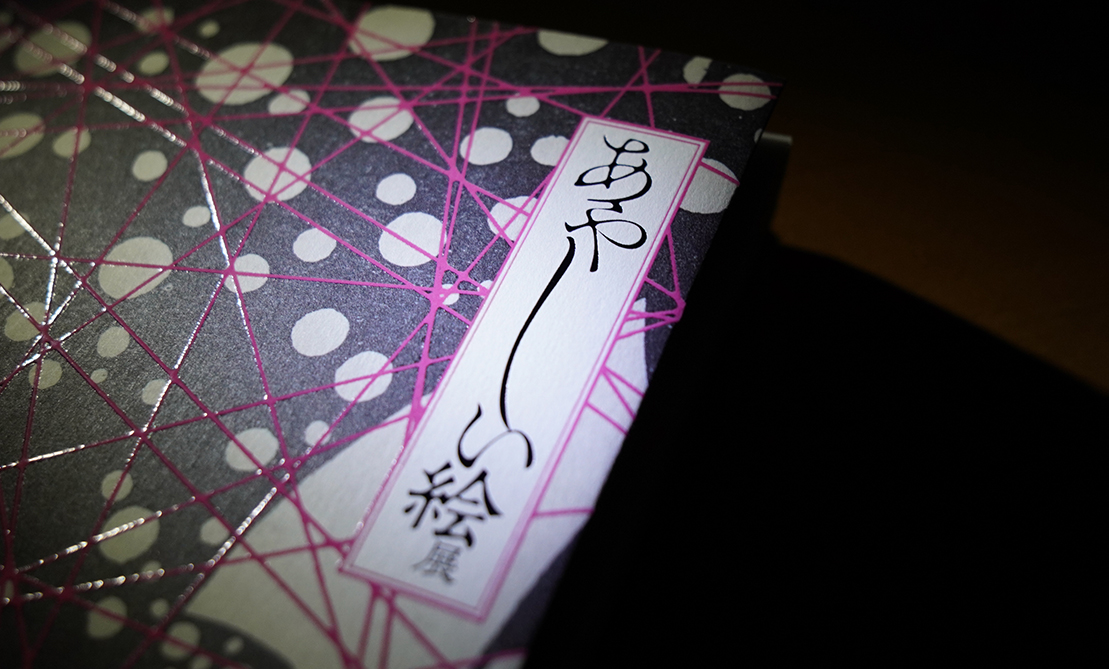 あやしい絵展 開幕まで準備が進んでいます。今回はカタログの表紙をチラ見せ。シックでキラキラ、絡まる糸はピンク色。水島爾保布の作品を使った表紙になりました。