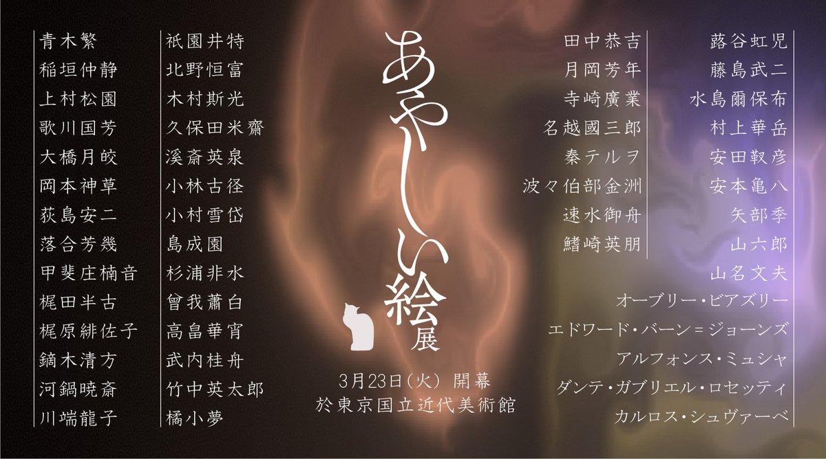 あやしい絵展(@ayashiie_2021)の出品作家をご紹介。展示替えがあるので一堂に会するわけではありませんが、日本画家から挿絵画家、生人形師までなかなかに壮観です。気になる作品は、公式サイトや当館のHPで公開している作品リストをチェックしてみてください!