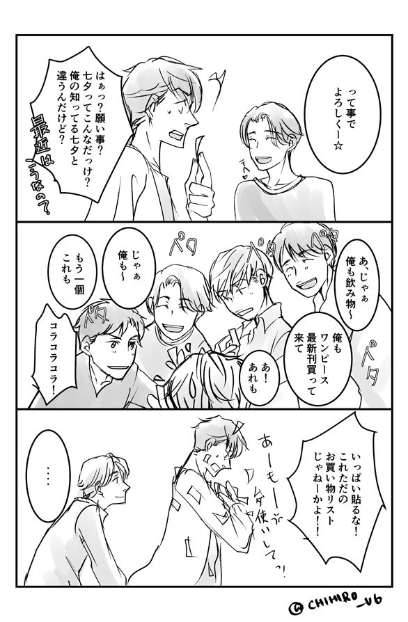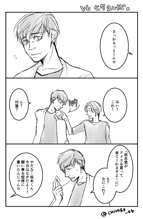 #V6版深夜の真剣お絵描き60分一本勝負 大遅刻です。スミマセン。難産だったわりに結局いつものパターン....。坂本君お誕生日まんがのオマージュ?的な??そしていつも以上に絵が雑ですみません。
