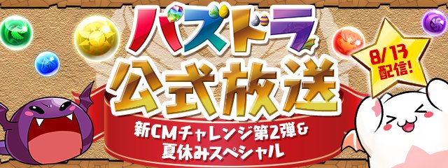 8/13(金)21:00頃より、WEB特別動画「パズドラ新CMチャレンジ 第2弾」と、「パズドラ公式放送~夏休みスペシャル~」が配信されることになりました‼