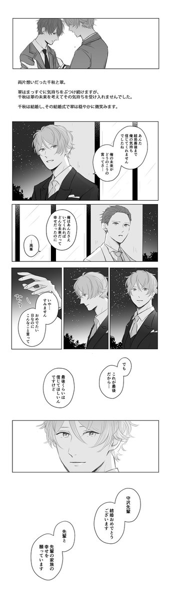 お題:元恋人(もしくは両片思い)で既婚者子持ちな千秋と翠な翠千 考えていたらだいぶ長くなってしまったのでダイジェスト(?)の縦長まんがです…半端な感じですみません~リクありがとうございました!