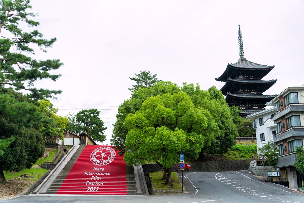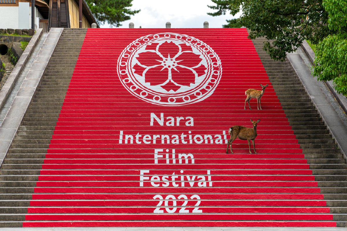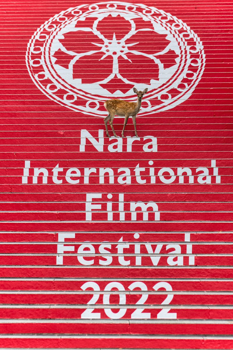 なら国際映画祭が奈良公園周辺で行われてます!レッドカーペットのように飾られた五十二段に主役!?の鹿さん親子がやってきました^ ^ 9月24日まで