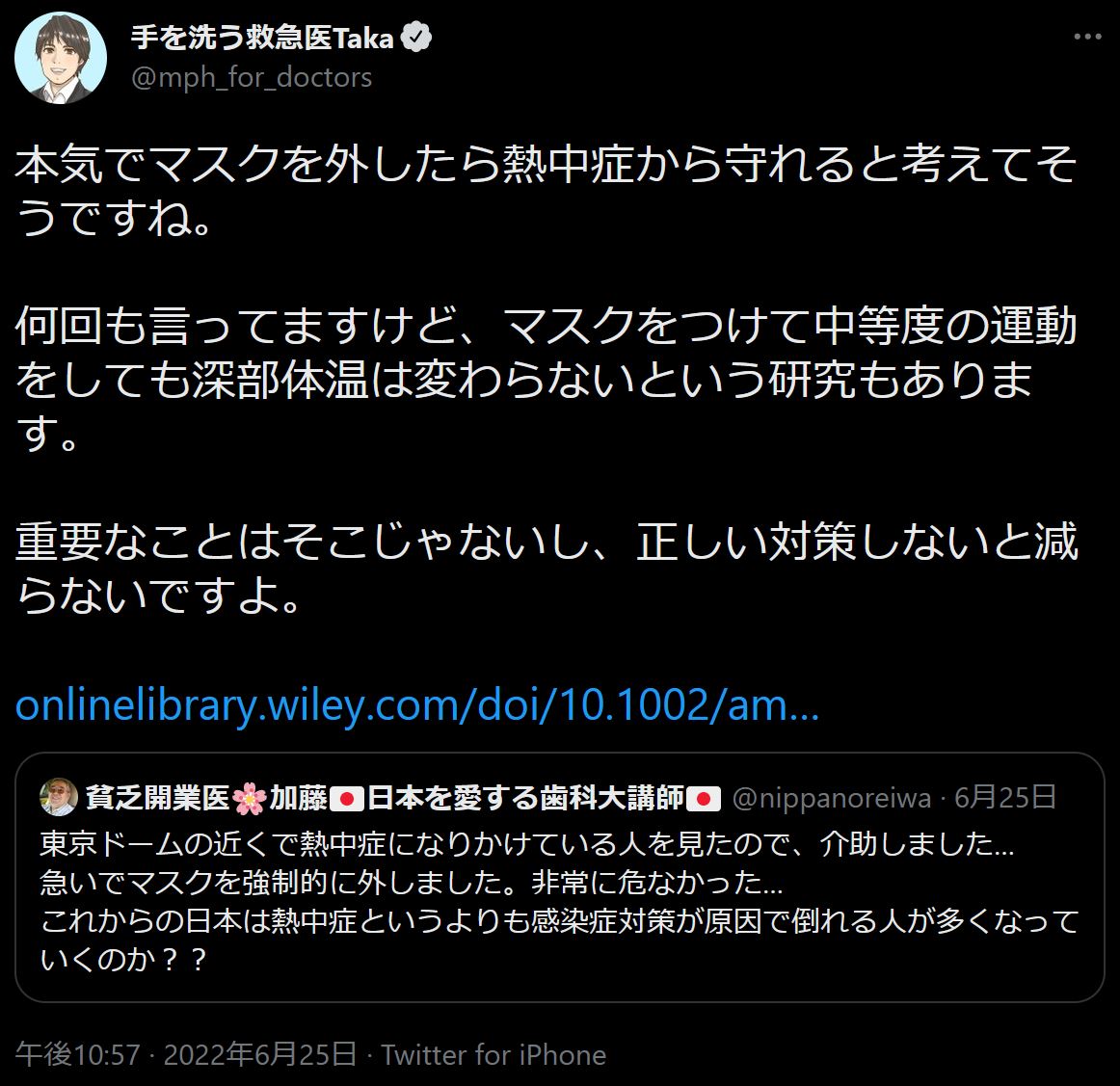 木下喬弘くん、そこまで言うならば『熱中症になりかている人がマスクしても深部体温は変わらない』研究を出さねばなりませんね。そんな非人道的な研究はできません。ほんとに救急医なのでしょうか。