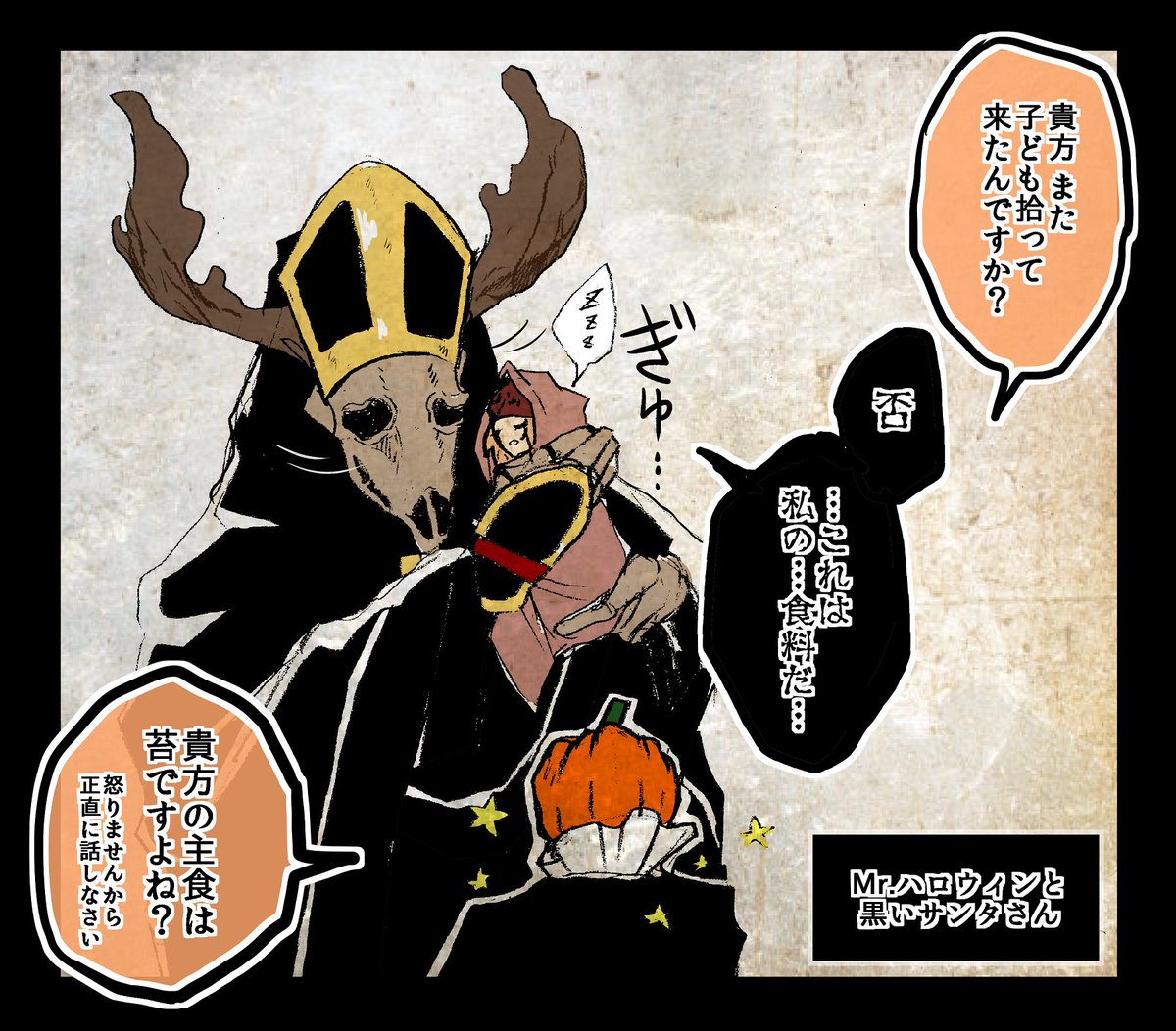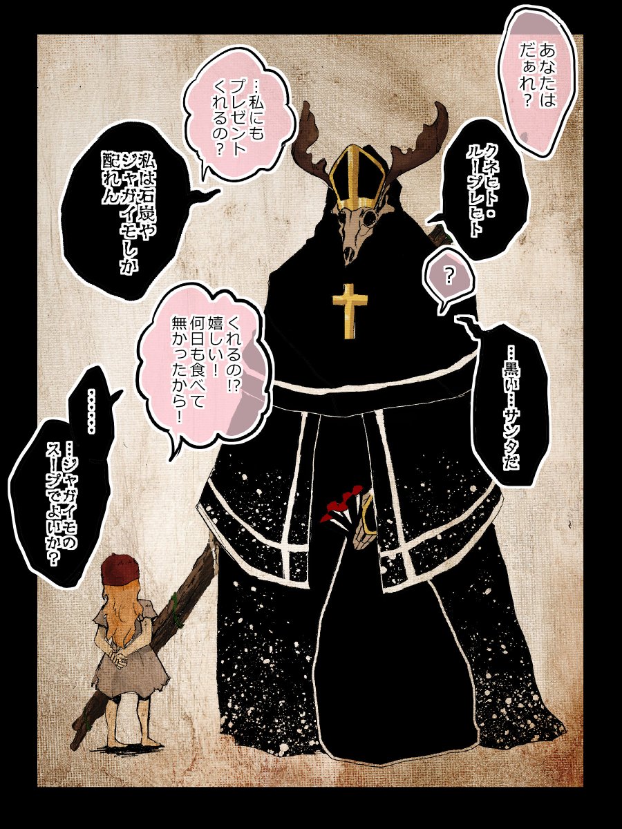 黒いサンタに関しての完全な独自解釈なんだけど、お国柄も含めてここでの『悪い子』ってのは「信仰深くあれない程、生活水準の低い子ども」だと思ってる。彼は体を温める石炭、腹を満たせるジャガイモ、栄養価の高いモツとかあげるし。本当に罰するつとりなら、もっと使い道の無いものあげると思う。