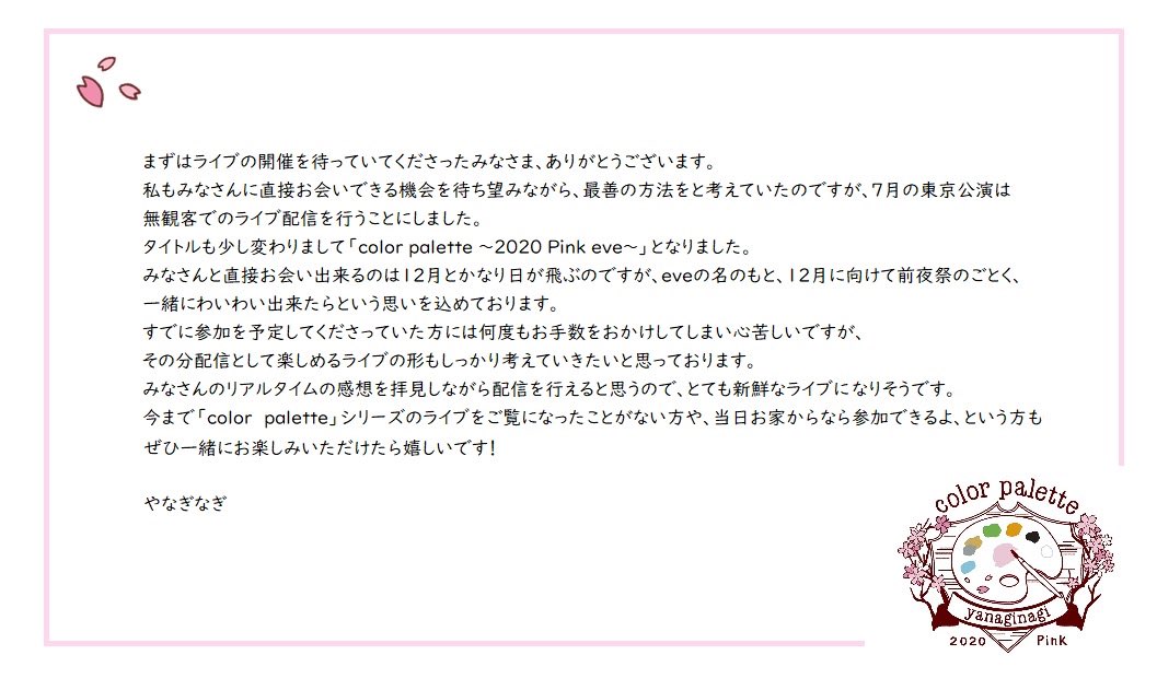 「color palette ~2020 Pink~」東京公演の再々延期に伴い、7月23日は無観客ライブをストリーミング配信することになりました。7月19日までのご注文で、配信に間に合う様グッズのお届けもはじまりました。特殊な形ではありますが、おうちからぜひお楽しみ頂ければと思います!