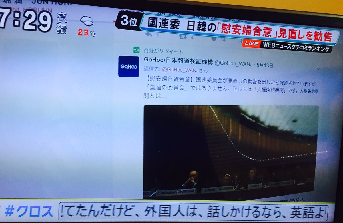 【慰安婦日韓合意】東京MXモーニングクロス@morning_cross でも当初「国連が見直しを勧告」と報じられましたが、放送中にMC堀潤氏より日本報道検証機構によるファクトチェック記事が紹介され、事実上訂正されました。
