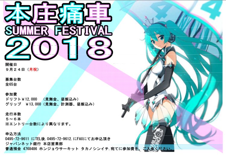 【無料走行キャンペーン】 9月24日(月祝)痛車走行会に抽選で3名の方を無料招待させていただきます🐎 《応募方法》 ① 本庄サーキットのアカウントをフォロー ② このツイートをリツイート 締切は9月21日(金)9時までです。 宜しくお願いします(⸝ᵕᴗᵕ⸝⸝)🏁