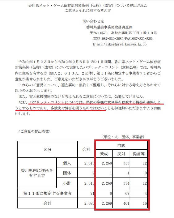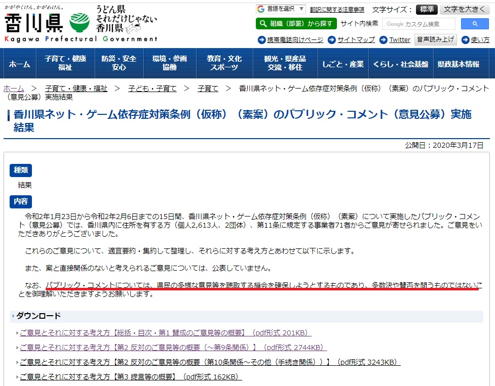 香川県ゲーム規制条例に対するパブコメ結果概要が本日(議会最終日前日)公表されました。