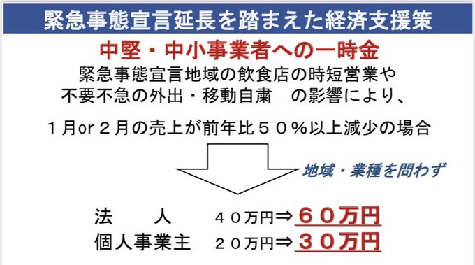 新聞で先に流れてしまましたが『フリーランスを含む個人事業主には最大100万円を支給』が今晩決まります。これは山田太郎議員@yamadataro43や多くの仲間の声で実現したものです。