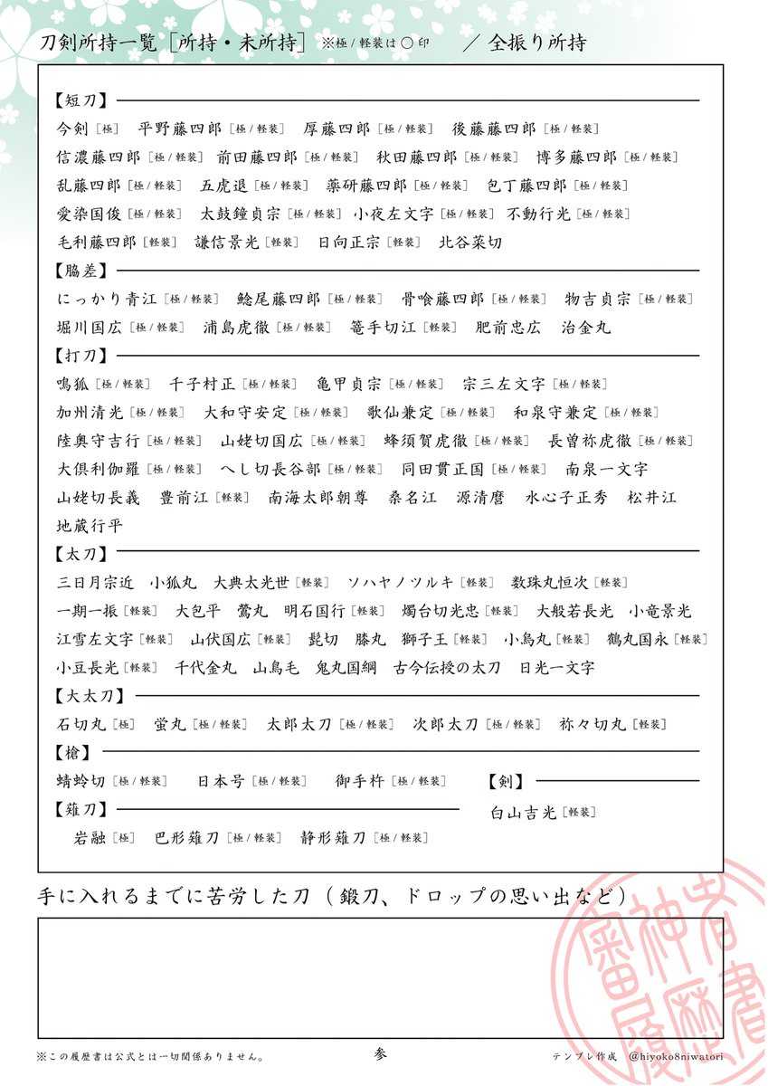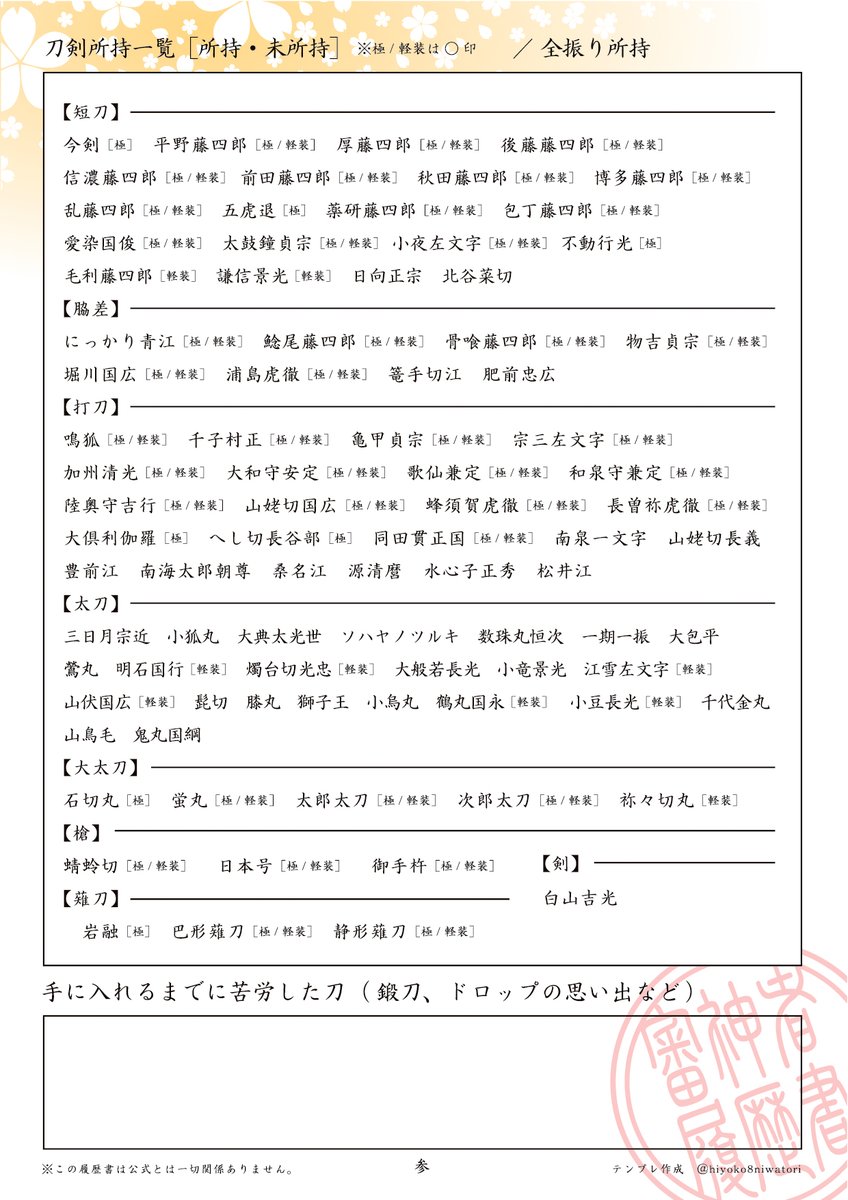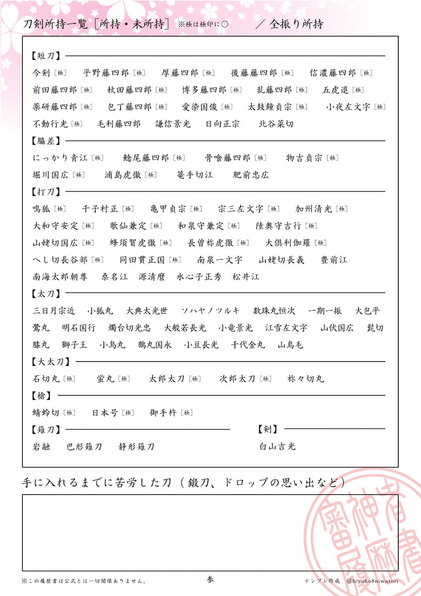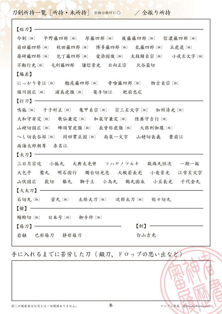 御手杵極実装にともない、審神者履歴書のテンプレ更新しました。