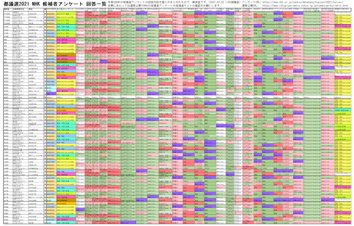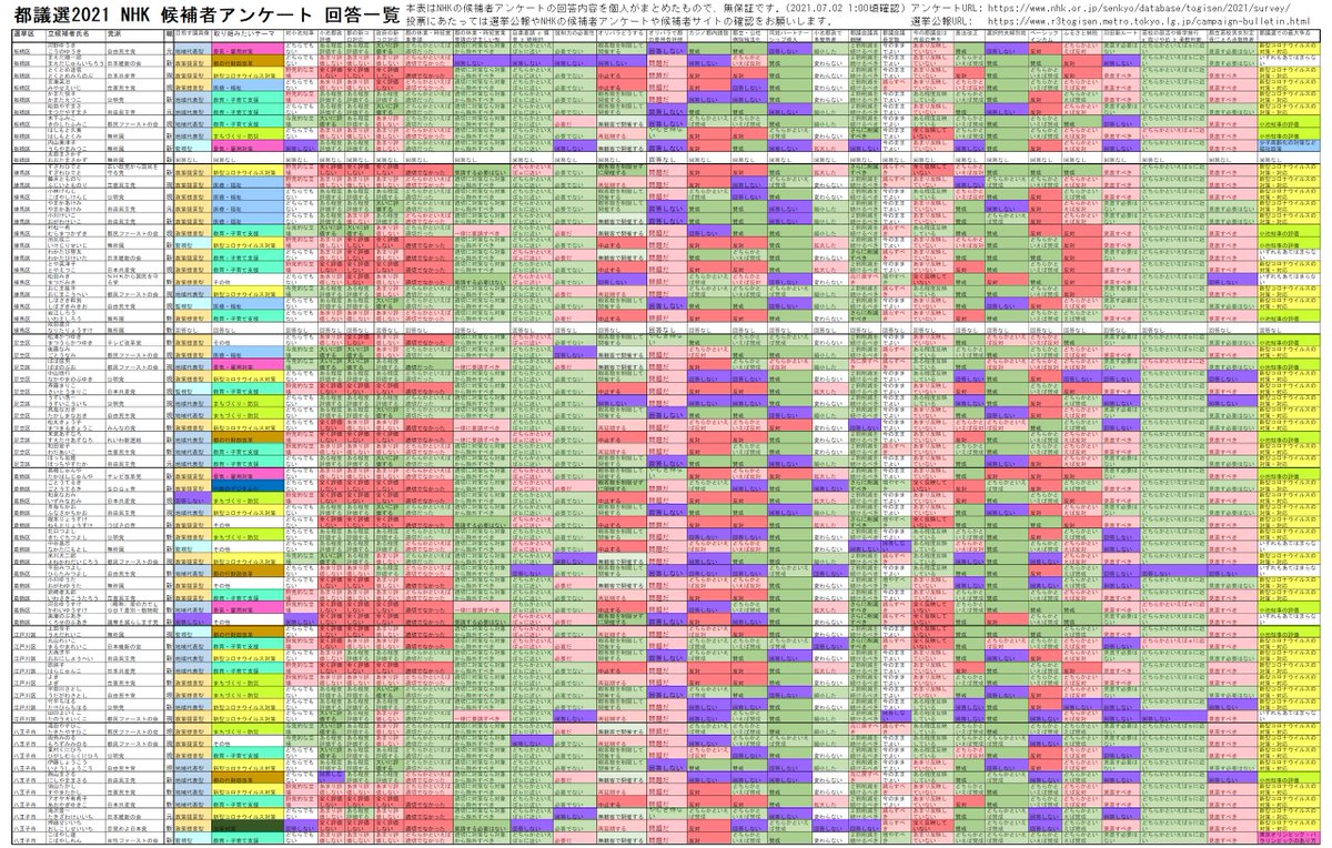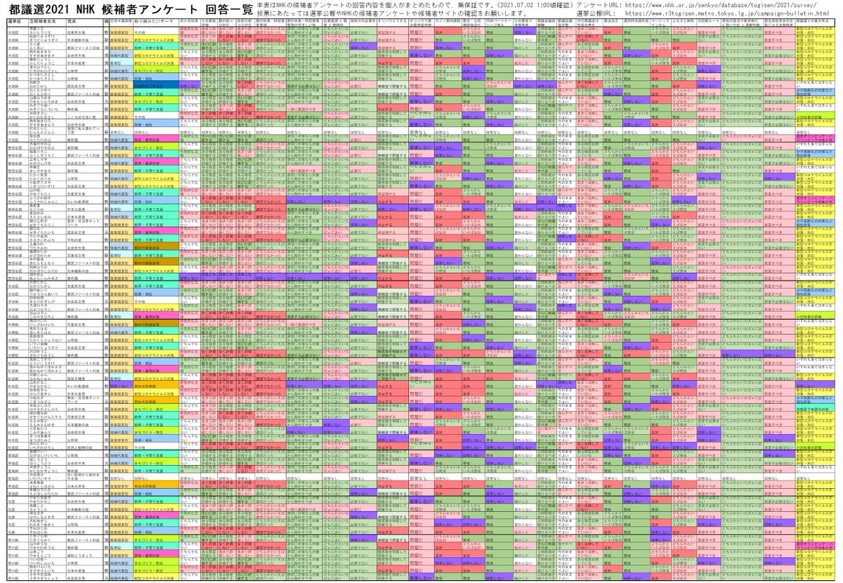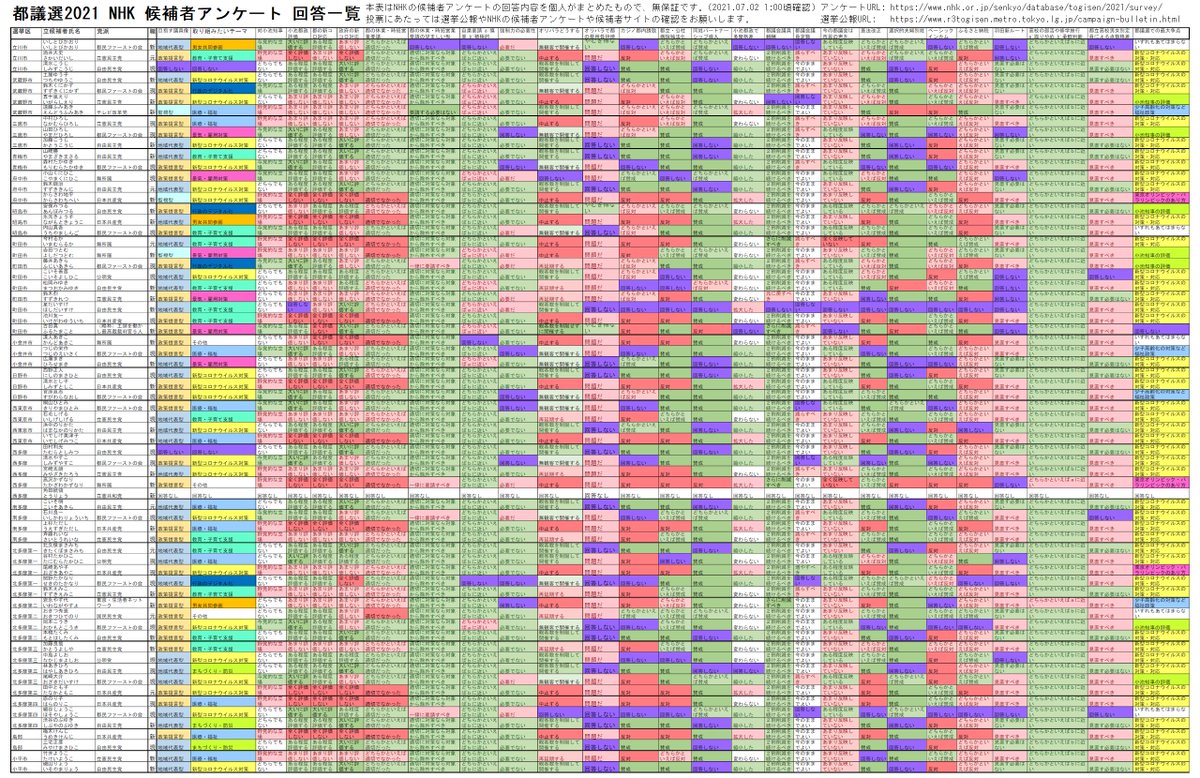 NHKの都議選2021 候補者アンケートの回答一覧をまとめました。
