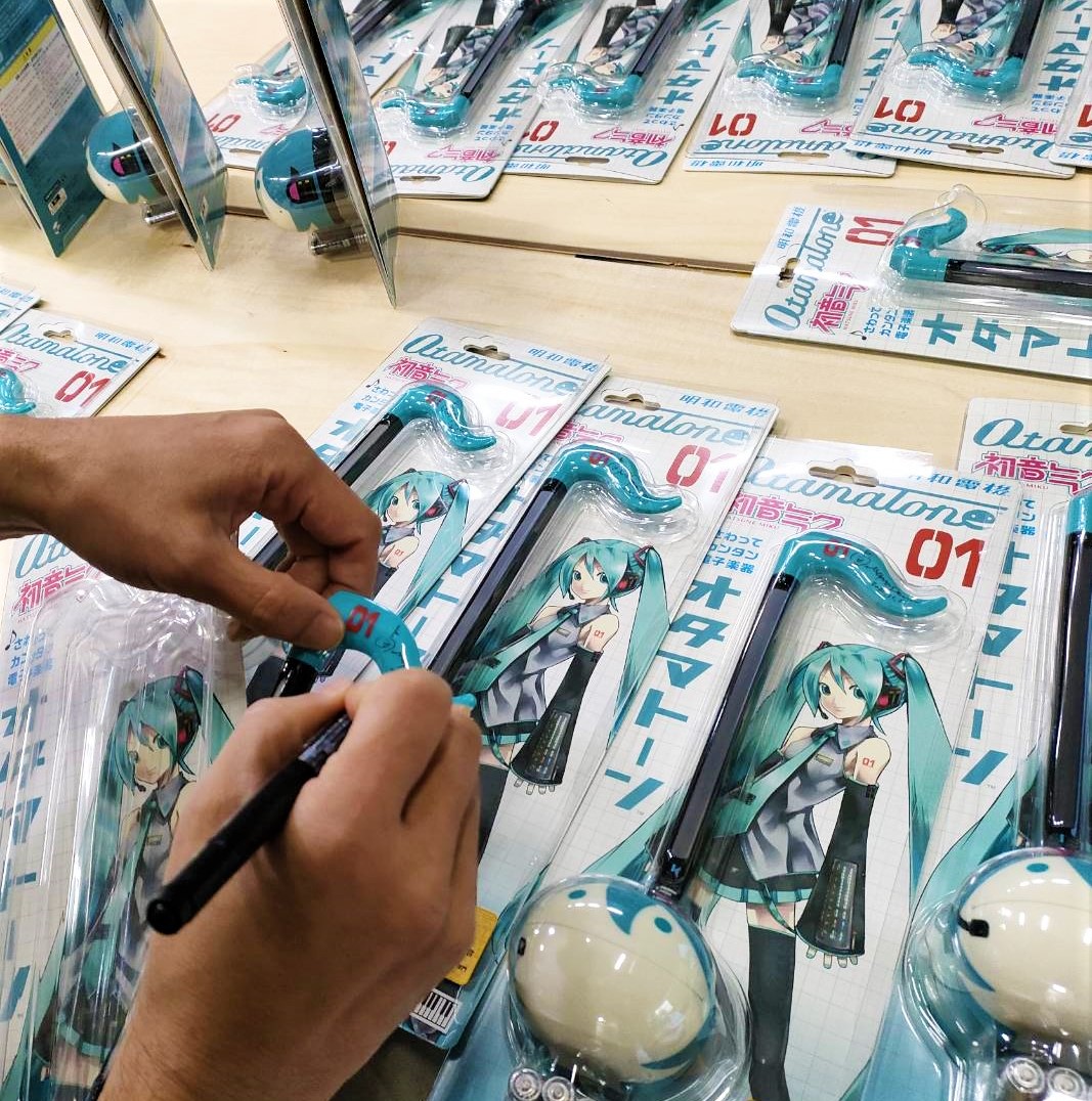 オタマトーンの初音ミクバージョンとどいた!ひたすらサインを入れてます。 twitter.com/MaywaDenki/sta…