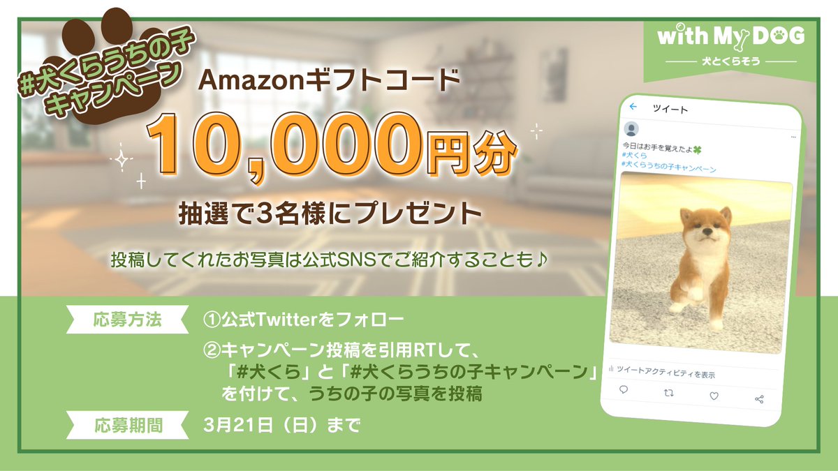 ②#犬くら と #犬くらうちの子キャンペーン を付けて、引用RTで『with My DOG』のお気に入りの子犬の写真を撮影して投稿