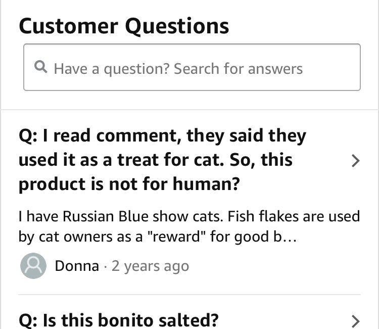 カスタマーQも「自分で食おうと思ってたのに猫用レビューだらけなんだけどこれ人間用だよね…?」と困惑しててワラタ