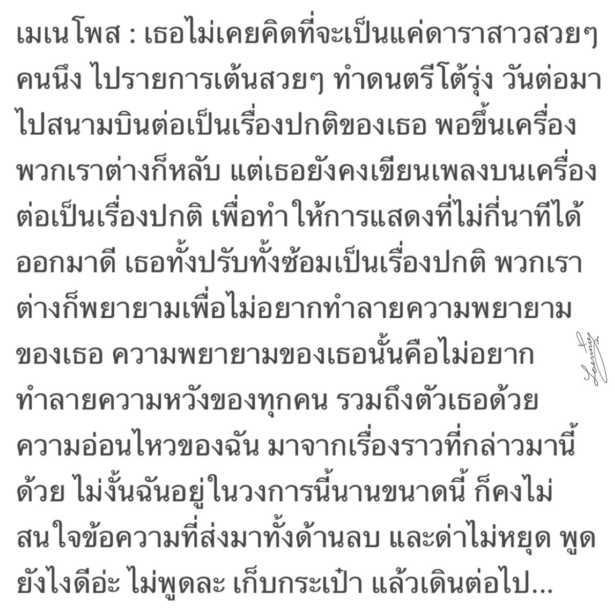 ผู้ใหญ่ในวงการ (พีดี, ผกก ซีรีย์, A&R Sony) ต่างก็ชม #เนเน่ ว่า สวยน่ารัก มีความสามารถ นิสัยดี ตั้งใจทำงาน มีความอดทน การแสดงเยี่ยม หวังว่าจะได้ร่วมงานกันอีก และเป็นดาราที่มีความพยายามมากที่สุดเท่าที่เคยเจอมา เชื่อว่าในอนาคตเส้นทางของเนเน่จะดีขึ้นเรื่อยๆ 🥺🥺🥺
