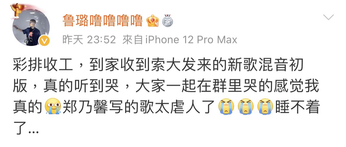เมื่อคืนเมเนโพส หลังจากเสร็จงานซ้อมคิวกาล่า พอถึงบ้านก็ได้รับมิกซ์เบื้องต้นของเพลงใหม่จากพ่อโซนี่ ฟังแล้วร้องไห้เลยจริงๆ ทุกคนต่างก็ร้องไห้กันในกลุ่ม ฉันแบบว่า😭 เพลงที่เจิ้งหน่ายซินเขียนนั้นซึ้งมาก😭😭😭 นอนไม่หลับแล้ววว...