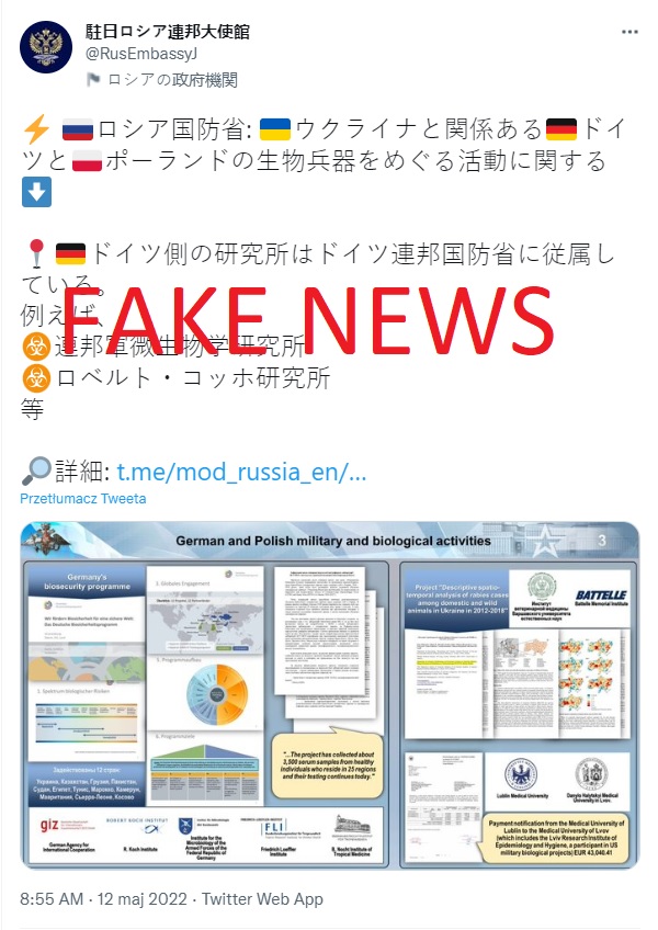 駐日ロシア連邦大使館はポーランドとドイツが協力して生物兵器を開発しているという情報を拡散していますが、これはデマです。両国ともそのような活動には関与していません。ロシアは、ウクライナでの犯罪行為から世界の関心をそらそうとしているならず者国家です。#FAKE twitter.com/PLinTokyo/stat…